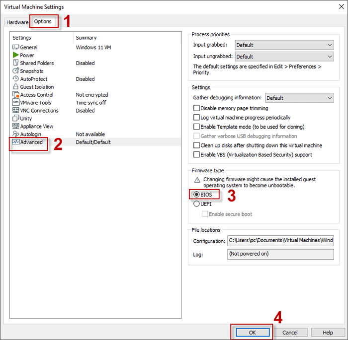 這VMware EFI 網絡超時問題通常是由固件不匹配引起的。 BIOS 和 UEFI 是用於啟動操作系統的兩個固件接口,但是UEFI 兼容性有限,並且並非所有主板都支持它。如果您選擇UEFI作為您的固件類型虛擬機虛擬機,這可能會導致EFI網絡超時錯誤。要解決此問題,請切換VMware 固件類型來自UEFI 到 BIOS以提高兼容性並避免VMware 超時 EFI 網絡問題。