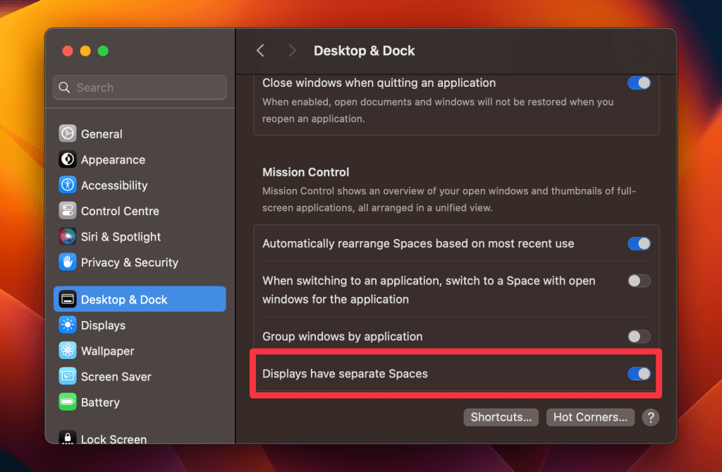 使用外部顯示器可以提高工作效率,但會增加 CPU 使用率。由於它們依賴於 Mac 的 CPU 來進行顯示輸出,因此 WindowServer 必須渲染所有窗口。要減少此負載,請禁用外部顯示器的單獨空間。