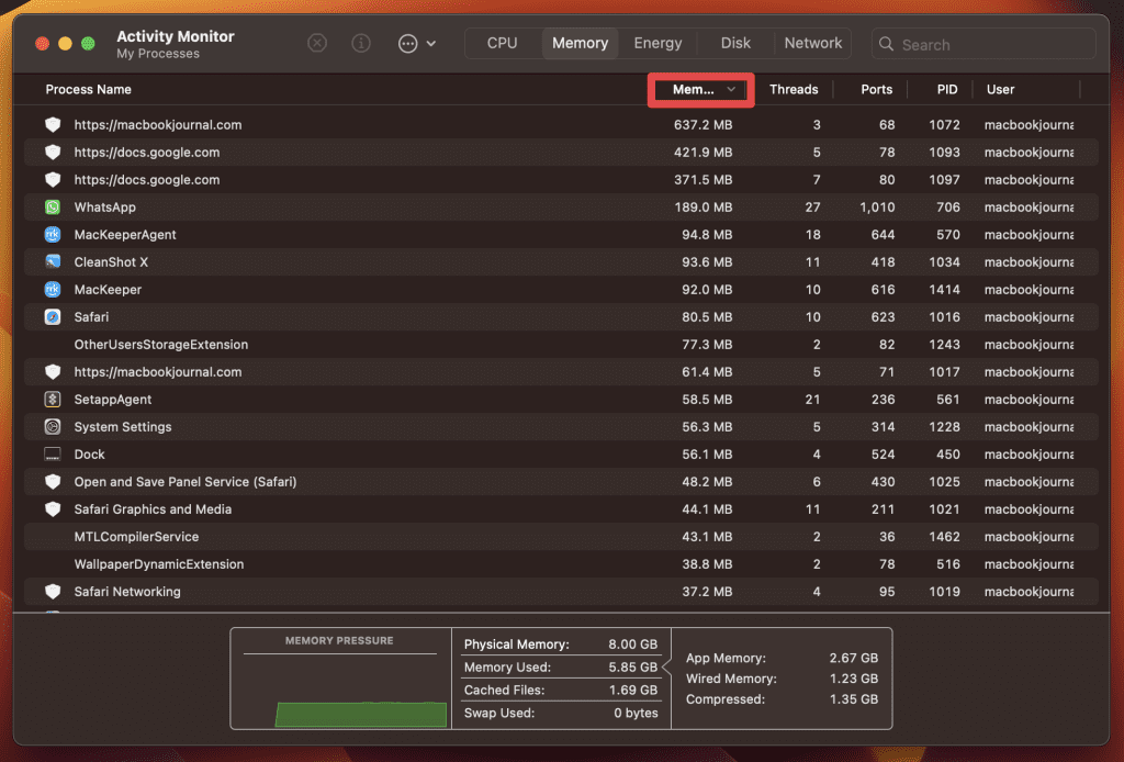 - 默認情況下,進程按內存使用情況排序。如果沒有,您可以通過單擊對列表進行排序記憶列以查看哪些應用程序使用的內存最多。