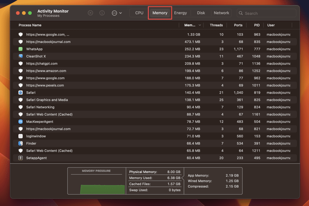 - 單擊記憶選項卡可查看所有正在運行的應用程序當前的內存使用情況。