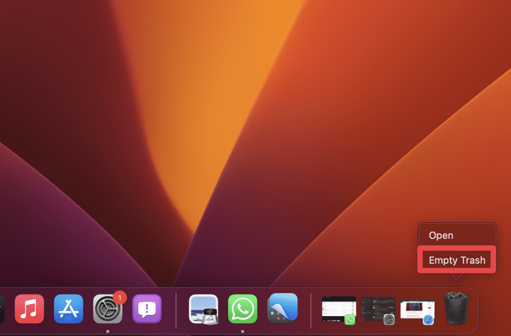 - 右鍵單擊 Bin 圖標並選擇,從 Mac 中永久刪除緩存清空垃圾箱。