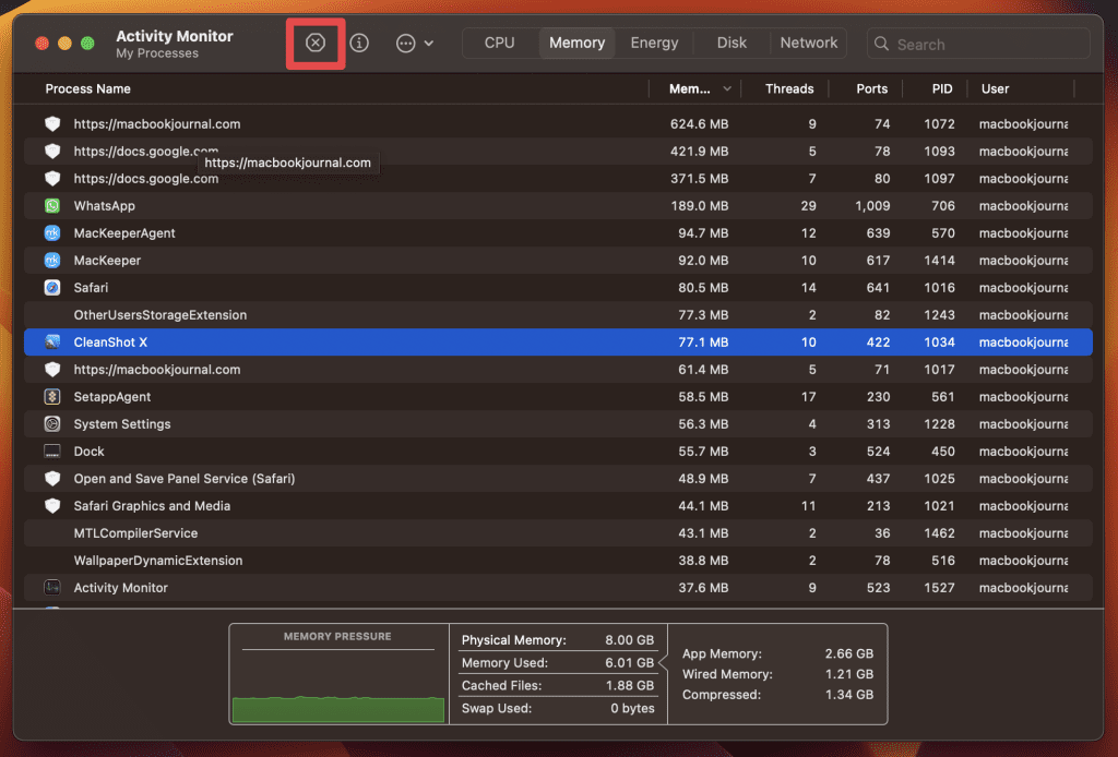 - 如果您發現某個應用程序佔用了大量您當前未使用的內存,您可以通過選擇該應用程序並單擊X按鈕位於左上角。