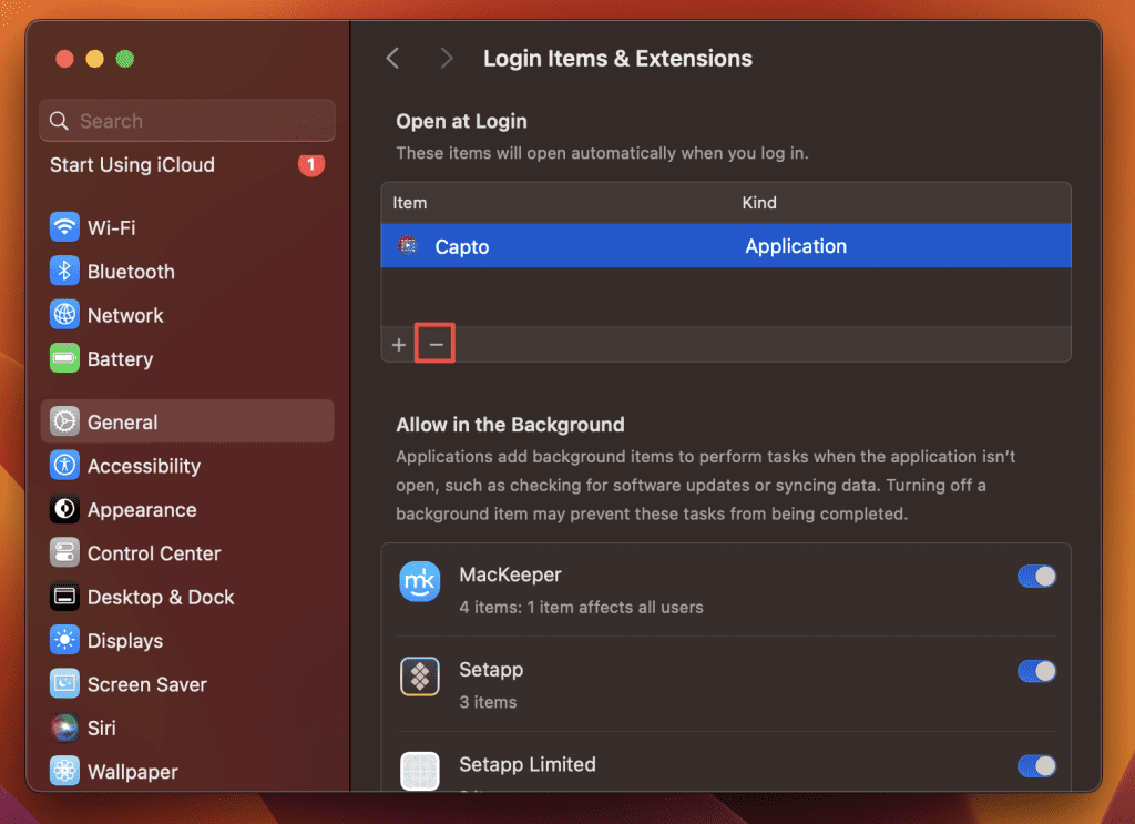 - 選擇您要刪除的登錄項,然後單擊–列表底部的按鈕可刪除登錄項。