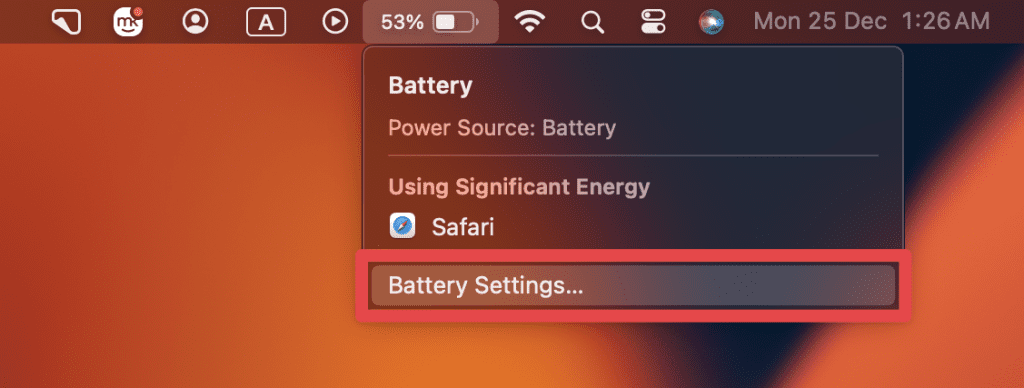 - 尋找電池屏幕右上角菜單欄上的圖標。點擊電池設置打開電池狀態菜單。