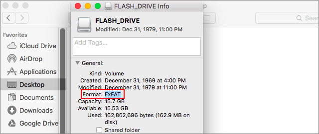 那麼如何知道您的 USB 驅動器的格式是否正確呢?您無需在“磁盤工具”上執行任何特殊操作 - 只需插入 USB 驅動器並打開 Finder。右鍵單擊 Finder 側邊欄(或桌面)中的驅動器圖標,然後選擇獲取信息。您將看到驅動器的文件系統顯示在右側“格式”上。