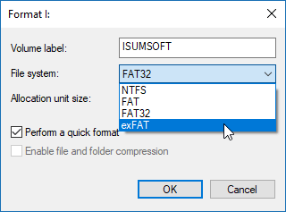 右鍵單擊要格式化的驅動器,選擇格式查看包括文件系統在內的配置列表。選擇外FAT對於這個驅動器。然後點擊好的按鈕繼續。