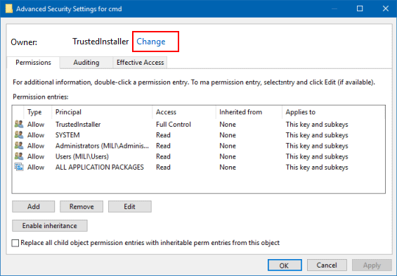 步驟 4:在“高級安全設置”對話框中,您可以看到當前所有者(可信安裝程序)您選擇的鍵。點擊改變關聯。