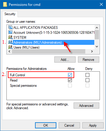 步驟7:返回權限窗口後,選擇所需的權限使用者名稱然後檢查允許下的複選框完全控制行,然後單擊好的。