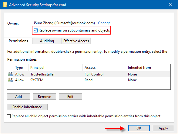 第 6 步:檢查替換子容器和對象的所有者選項。點擊申請和好的。