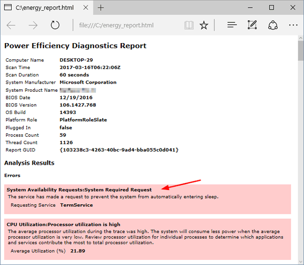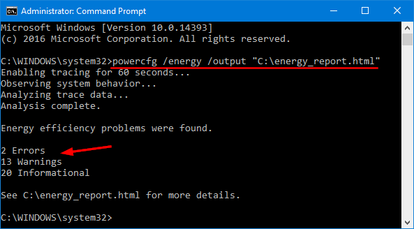 - 該程序將分析您的計算機 60 秒,然後在 C: 驅動器的根路徑中生成 HTML 報告。完成跟踪後,您將看到生成的名為 engery-report.html 的報告,其中顯示了電源配置中發生的所有情況,並為您提供了一些有關阻止筆記本電腦自動進入睡眠狀態的信息。