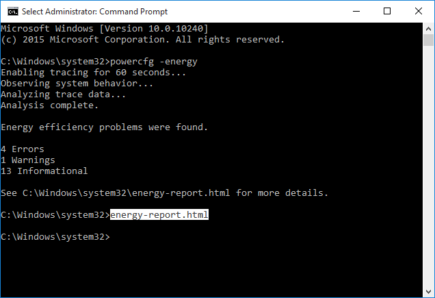步驟 3:在命令提示符下輸入powercfg – 能源,然後按進入鑰匙。