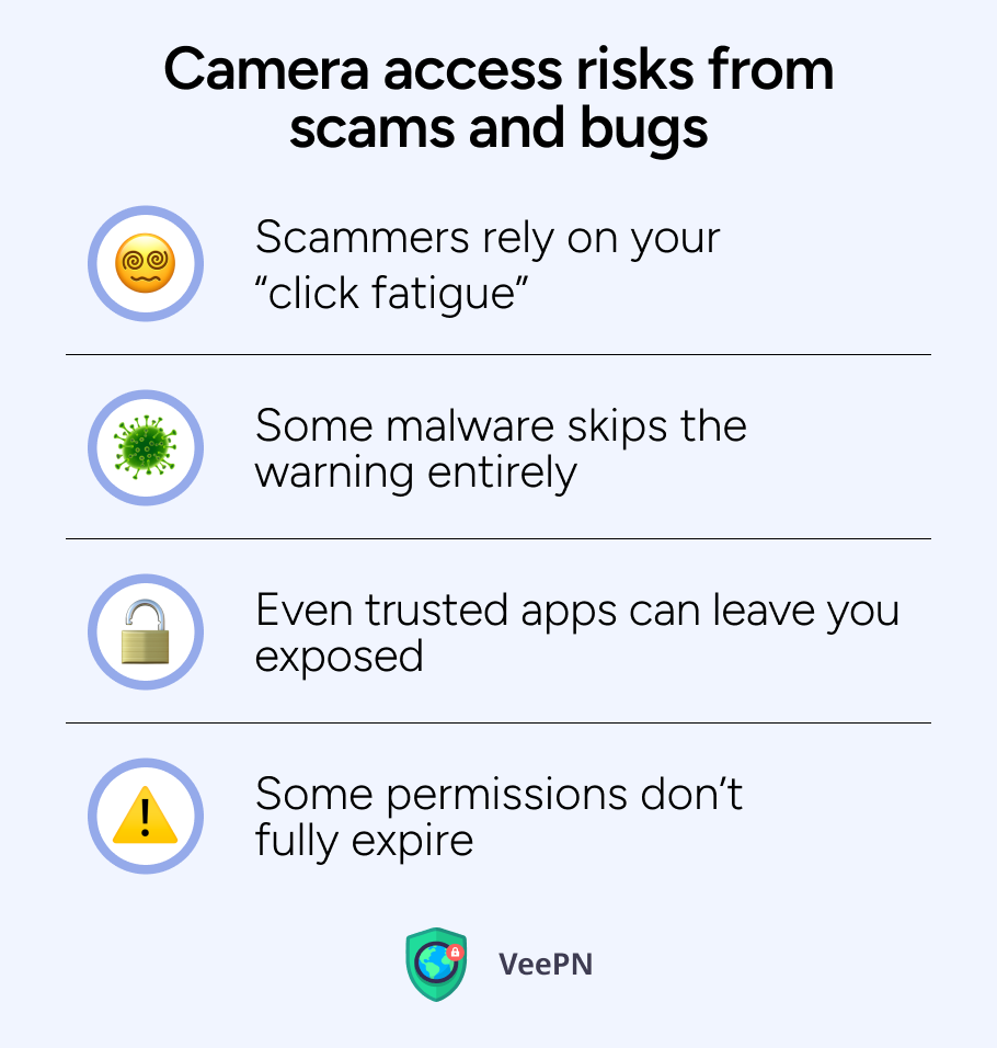 黑客指望人們盲目點擊權限彈出窗口。它被稱為許可疲勞,而且很常見。您停止閱讀,點擊“允許”,您的相機或麥克風可能會在您沒有意識到的情況下被騙子使用。