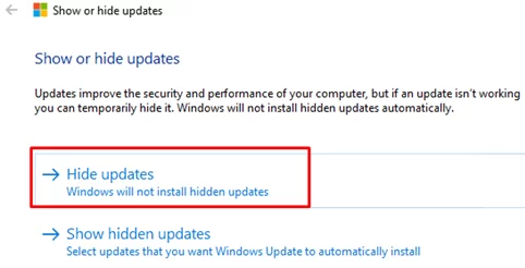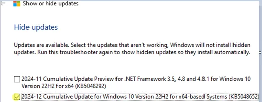 要使更新可供安裝,您需要選擇顯示隱藏的更新在 wushowhide.diagcab 實用程序中並取消隱藏更新。