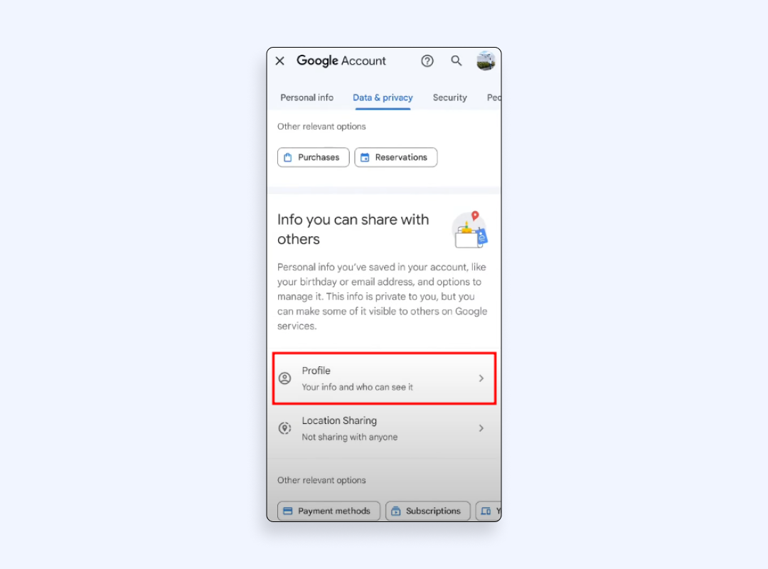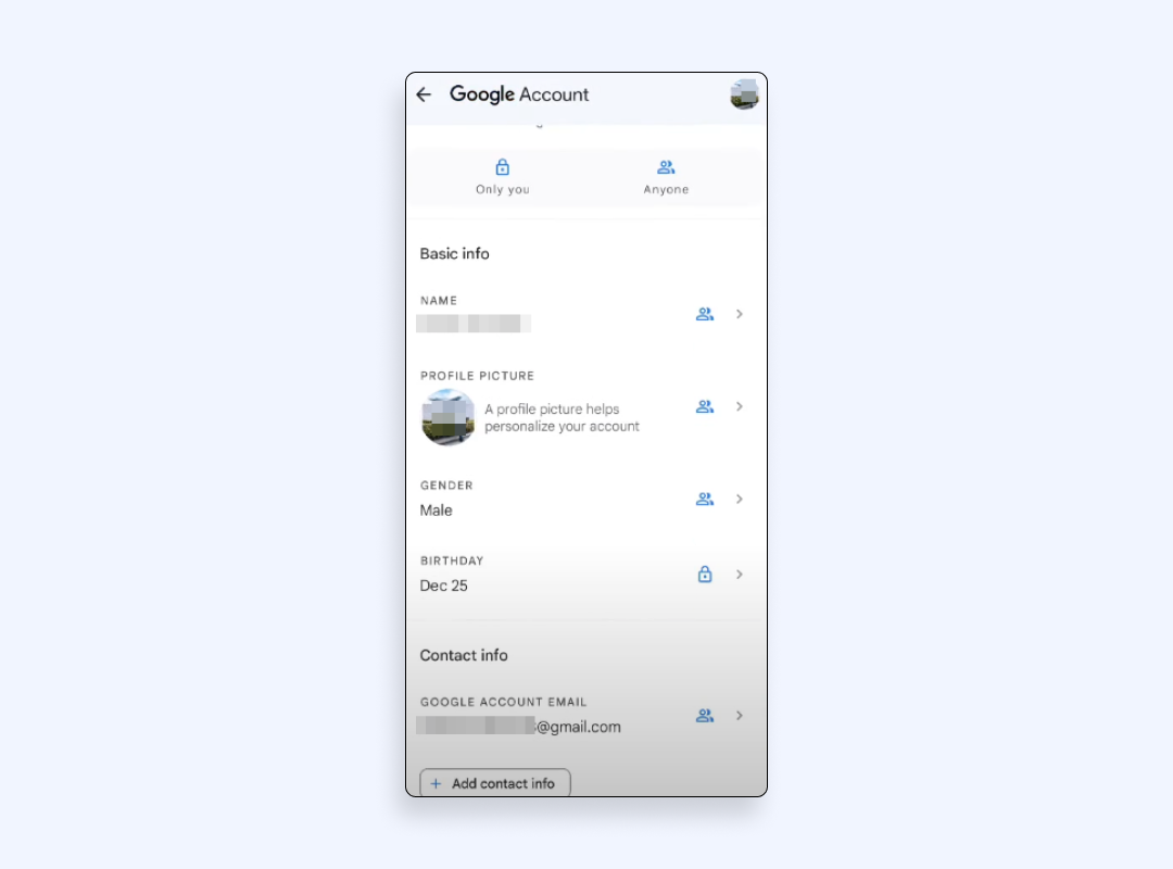 在個人信息中,您可以決定每個領域的受眾。將項目設置為“僅限您”,以對所有查看者隱藏它們,包括某些 Google 服務(例如照片或云端硬盤)中的聯繫人。公開片段會在大約 24 小時內消失。
