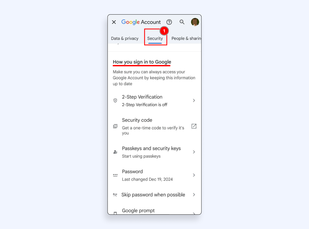 - 在“安全”→“登錄 Google”下啟用兩步驗證。
