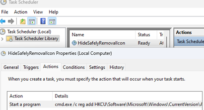 schtasks /create /tn "HideSafelyRemovalIcon" /tr "cmd.exe /c reg add HKCUSoftwareMicrosoftWindowsCurrentVersionAppletsSysTray /v Services /t reg_dword /d 29 /f && systray.exe" /sc ONLOGON
