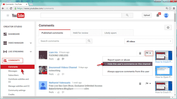 第 4 步:在“已發布評論”選項卡下,它會顯示您所有 YouTube 視頻上已發布的所有評論。找到您要隱藏或刪除的評論。單擊“垃圾箱”按鈕即可刪除此評論,然後單擊小旗按鈕並選擇“隱藏該用戶對此頻道的評論”這樣您就可以隱藏該用戶對您的視頻的評論。