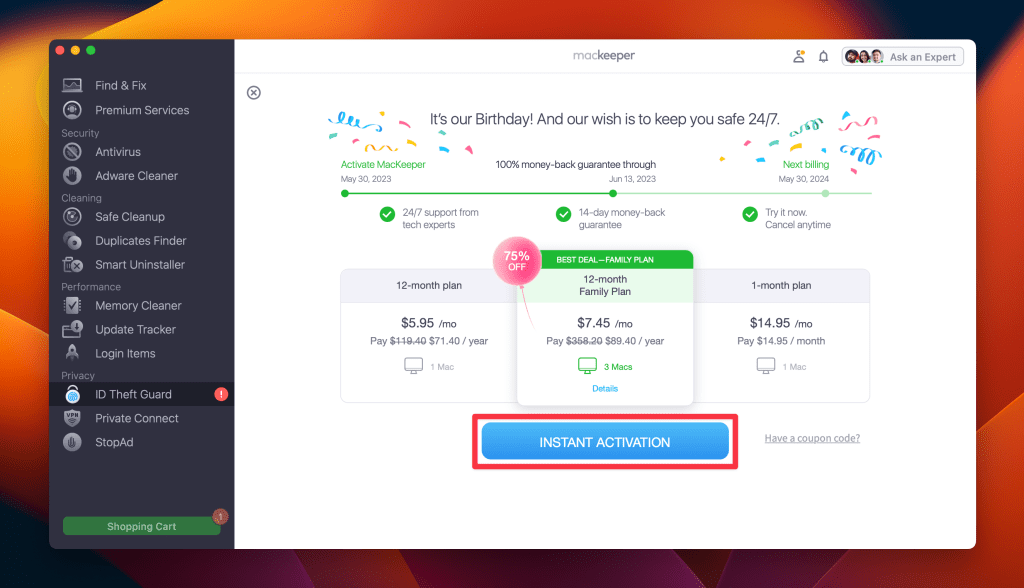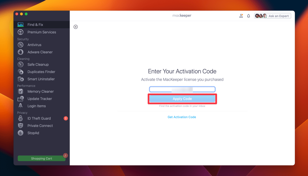 現在您已經有了激活碼,接下來可以激活 MacKeeper 許可證來訪問高級功能,例如病毒掃描、系統清理和安全保護。