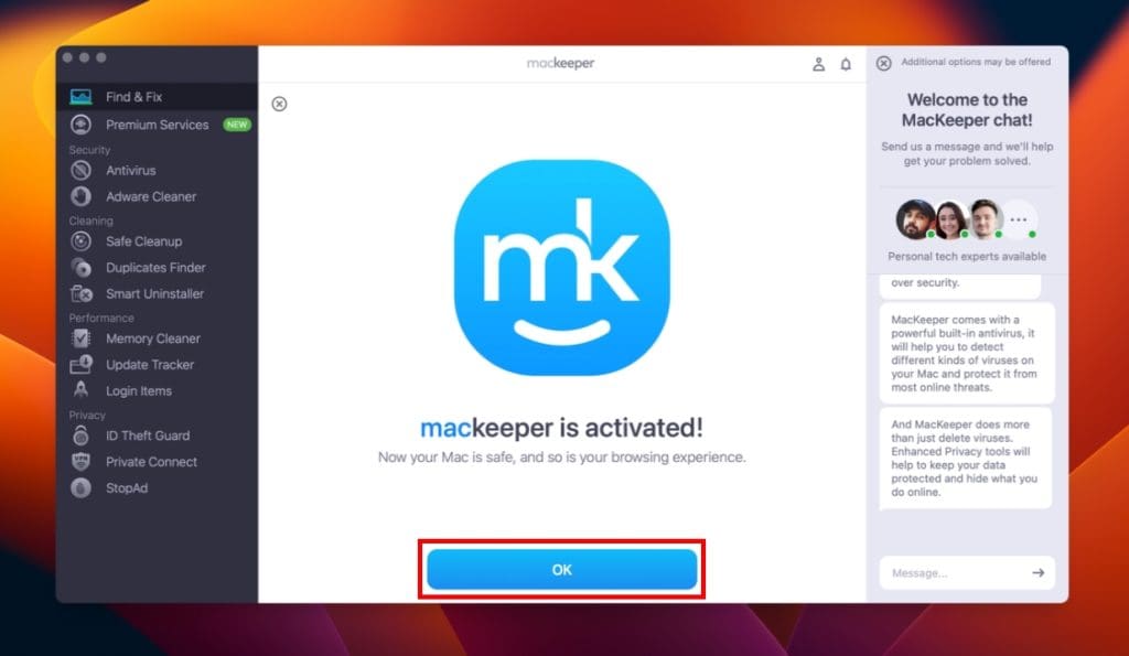 - 就是這樣。您的 MacKeeper 帳戶已激活。點擊好的以訪問其功能。