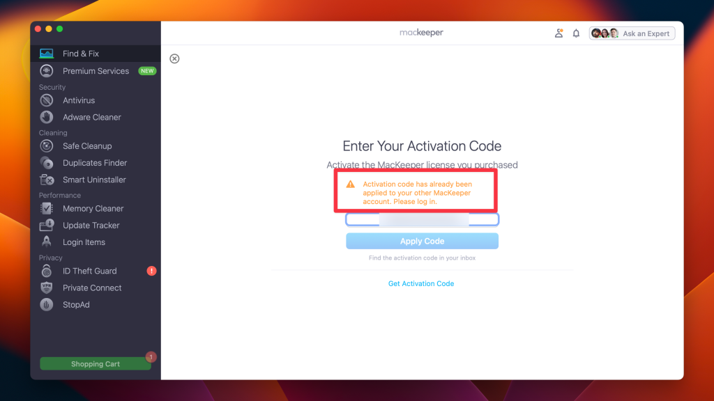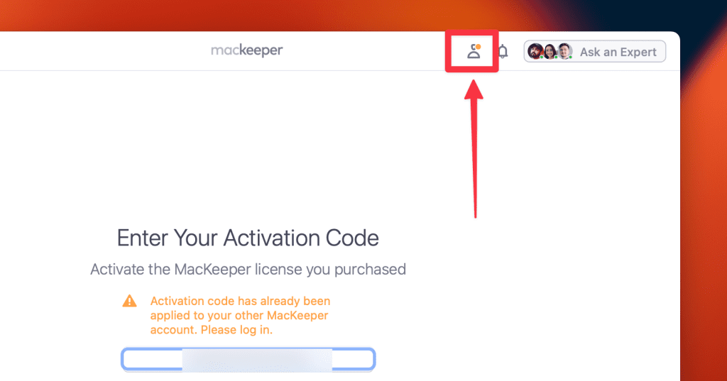 激活我的 MacKeeper 許可證時,我收到以下消息:“激活碼已應用於您的其他 MacKeeper 帳戶。請登錄。”