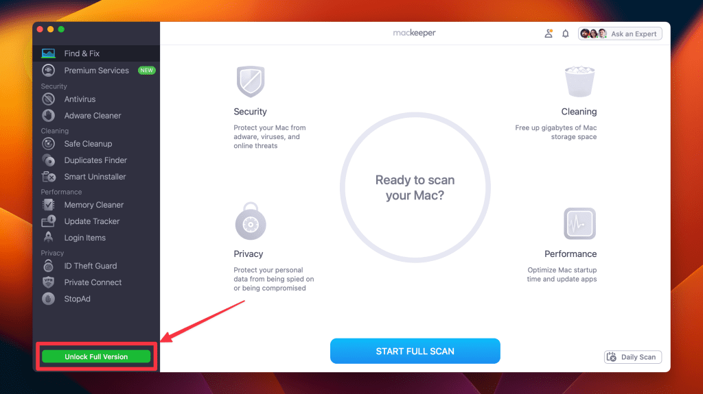 - 在 Mac 上啟動 MacKeeper,然後單擊解鎖完整版在左下角。