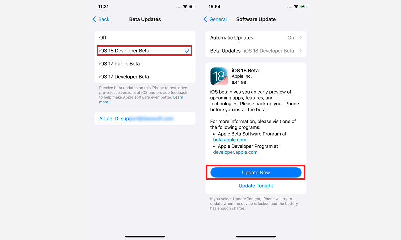 第5步:在此頁面上,選擇iOS 18 開發者測試版。然後點擊立即更新和