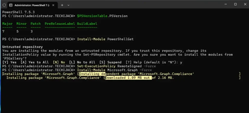 系統可能會提示您安裝NuGet 提供商並信任存儲庫 (PSGallery) – 輸入 Y 繼續。