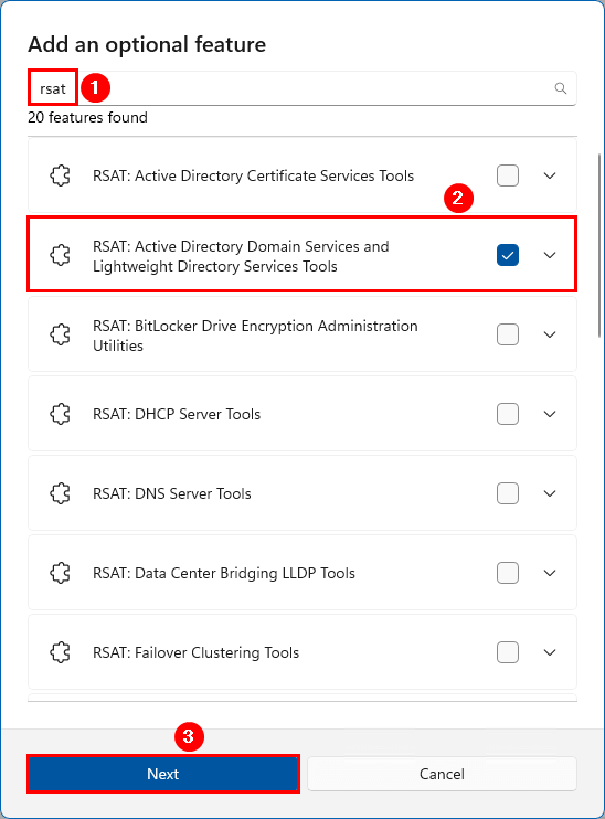 在我們的示例中,我們將安裝 RSAT:Active Directory 域服務和輕量級目錄服務工具。
