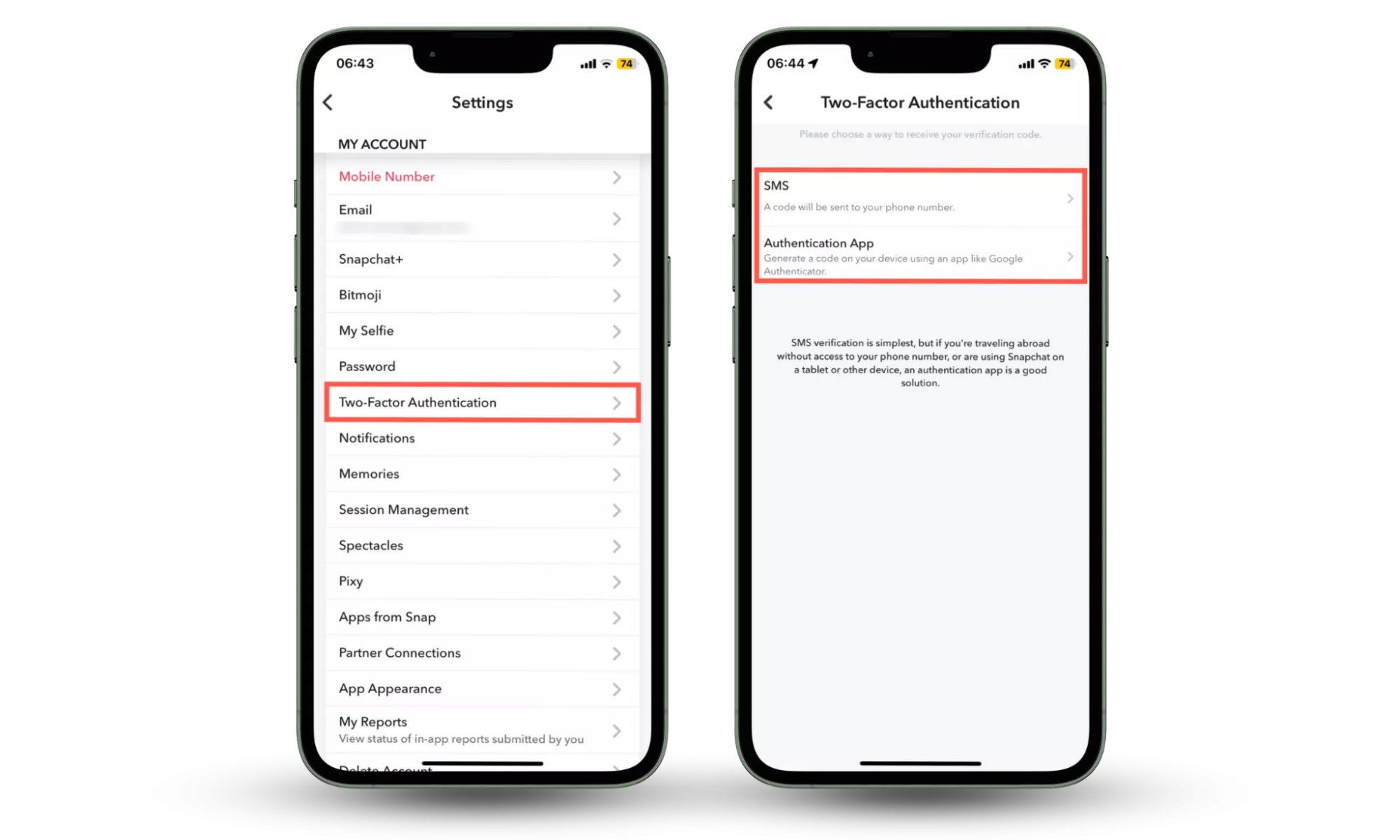 步驟 1-3:轉到 Snapchat 設置,點擊雙因素身份驗證,然後選擇一種身份驗證方法。