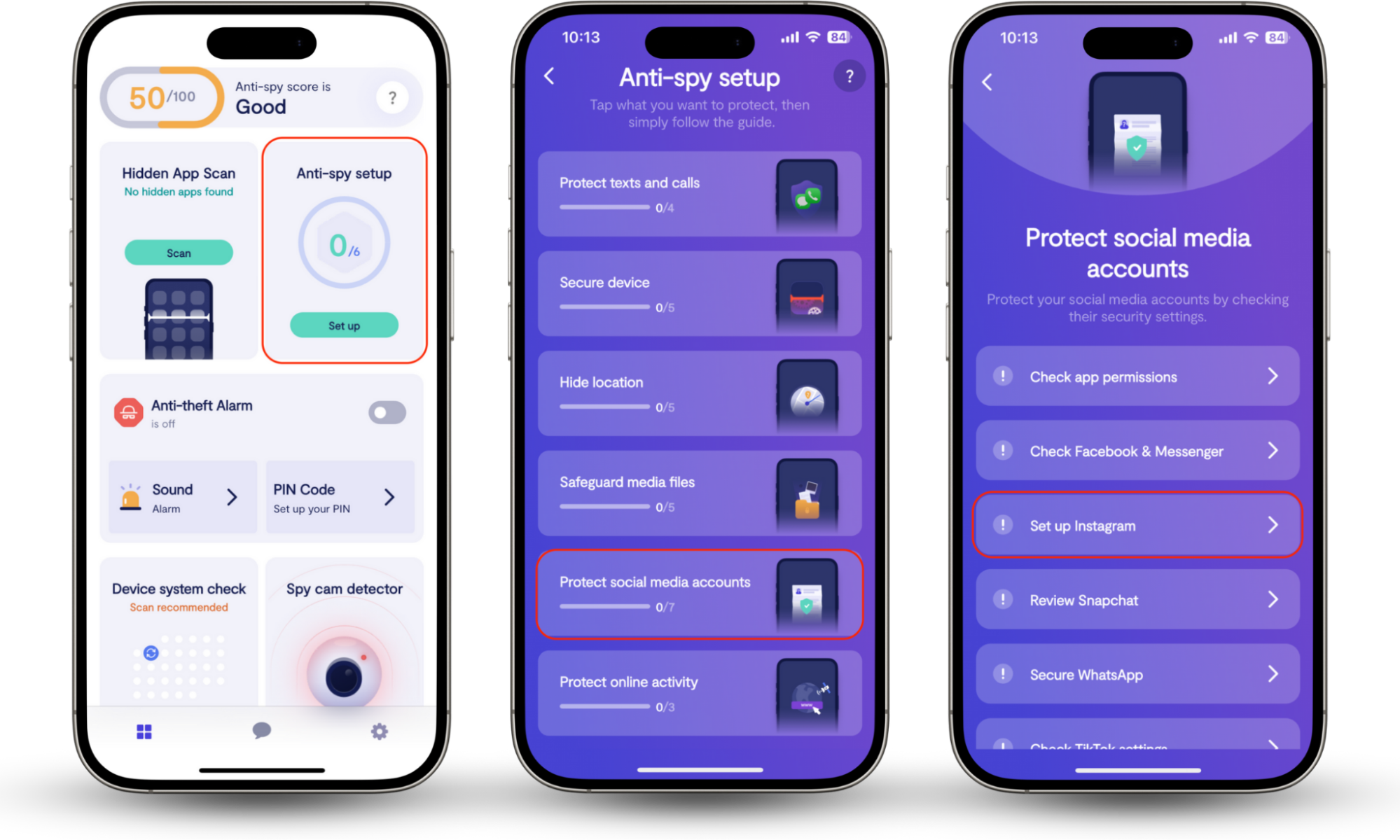 反間諜設置功能可指導您採取關鍵的隱私措施,幫助保護您的 Instagram 和其他社交媒體帳戶。以下是如何使用 Clario 的反間諜設置: