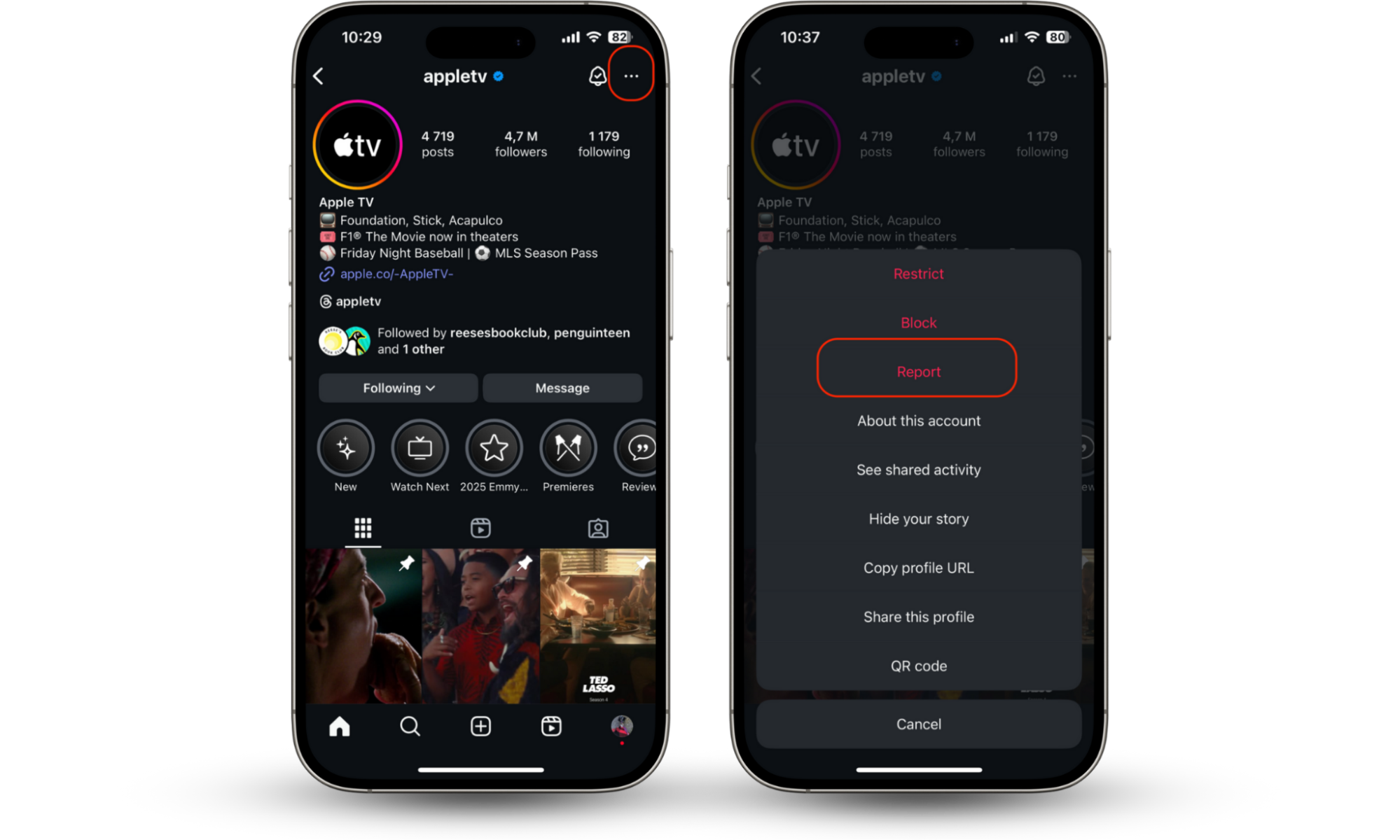 步驟 1-3。轉到他們的個人資料 > 點擊右上角的三個點 > 選擇報告並按照屏幕上的說明進行操作。