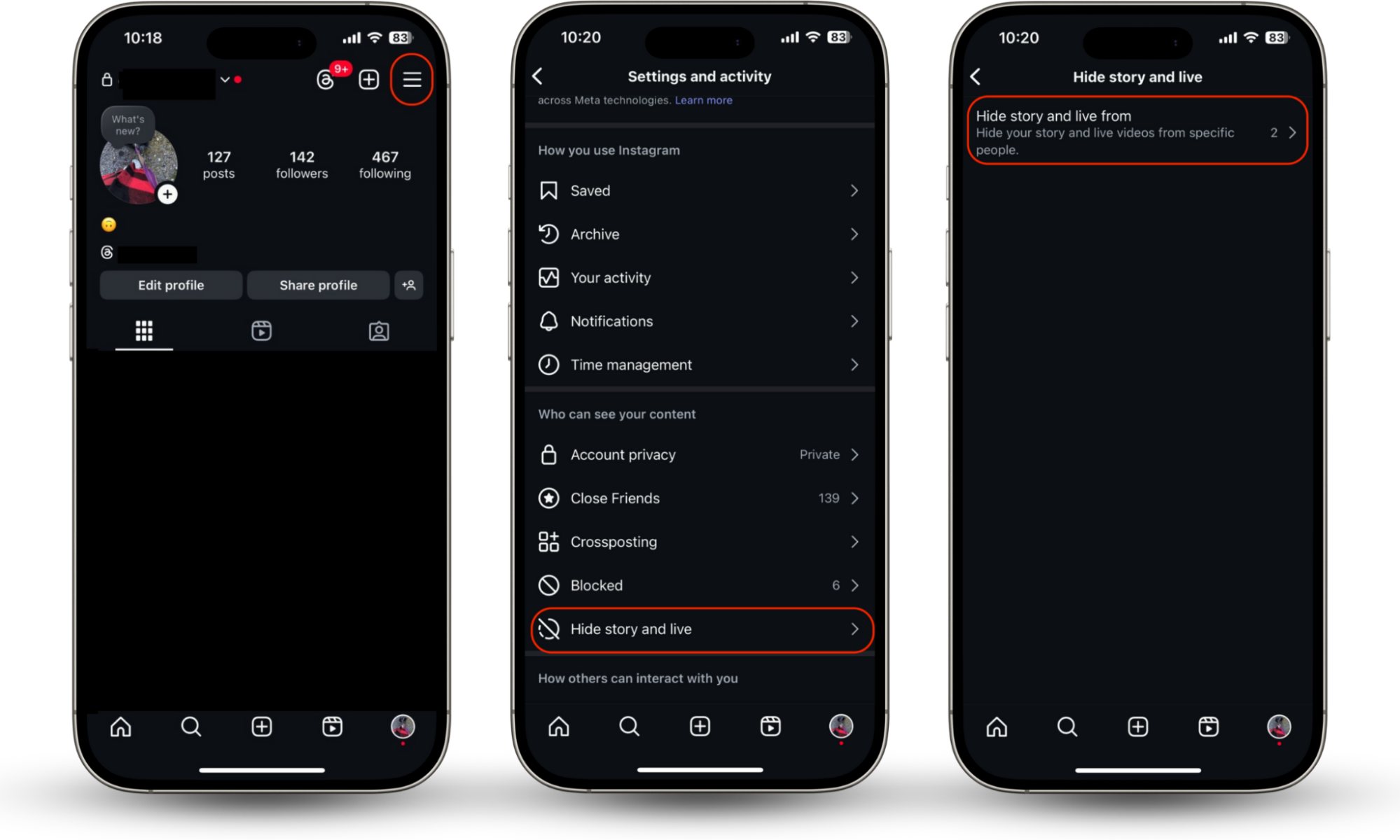 步驟 1-3。轉到個人資料設置 > 隱藏故事和直播