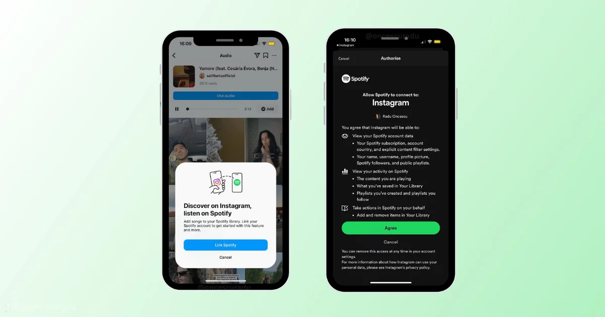 您還可以在與 Reels、Stories 或 Notes 中的 Spotify 曲目交互時鏈接 Spotify。只需點擊 Spotify 鏈接,Instagram 就會引導您完成連接過程。
