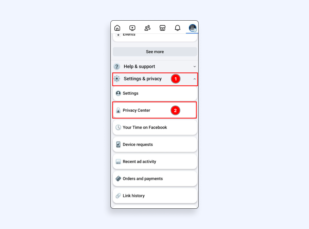 首先打開 Facebook 並點擊右上角的個人資料圖標。轉到“設置和隱私”>“隱私檢查”。
