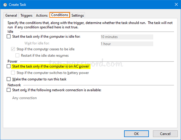 - 前往狀況選項卡,取消選中選項“僅當計算機使用交流電源時才啟動任務”並點擊好的。