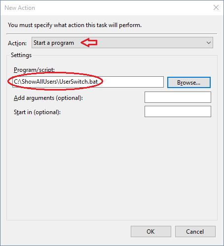 - 將動作類型設置為啟動一個程序。類型電源外殼在程序/腳本文本框中。將以下命令複製並粘貼到“添加參數”文本框中。單擊“確定”。