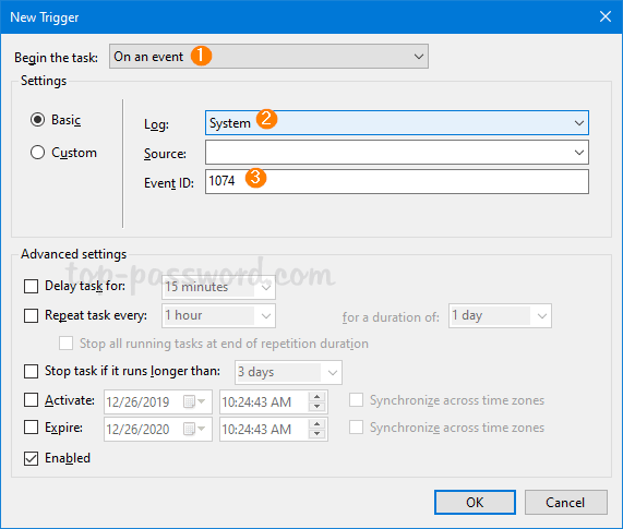 - 選擇在一次活動中在“開始任務”下拉列表中。單擊“日誌”下拉列表進行選擇系統, 進入1074(用戶啟動的關閉)在事件 ID 文本框中,然後單擊確定。