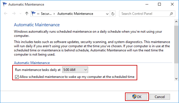 步驟2:更改時間、選擇或取消選擇允許定期維護在預定時間喚醒我的計算機,然後點擊好的。