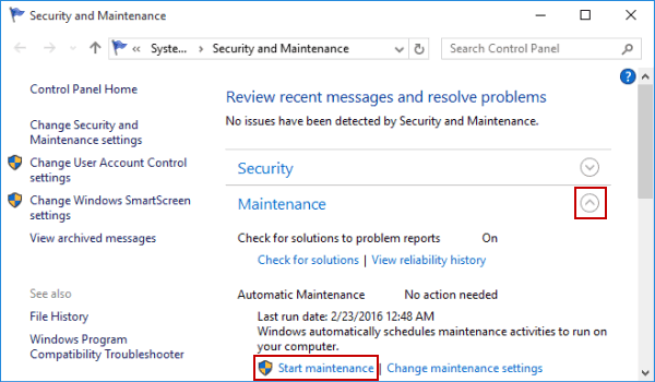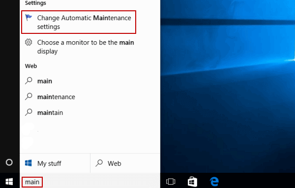 步驟1: 類型主要的在任務欄的搜索框中,然後單擊更改自動維護設置從結果來看。