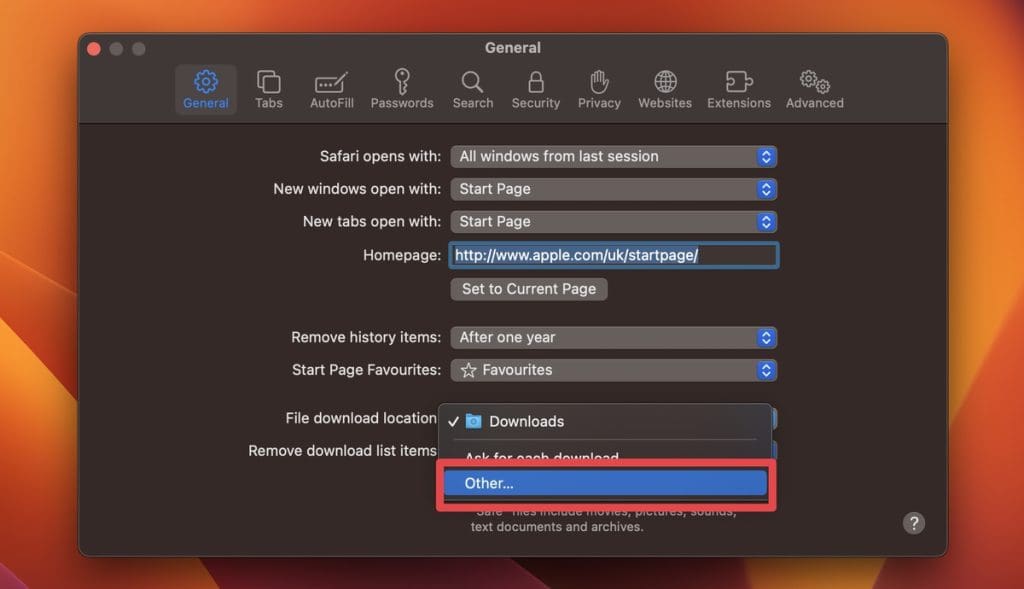 是的,您可以將瀏覽器配置為自動將文件保存到Mac上的特定文件夾。例如,在野生動物園中,您可以去設置>一般並選擇一個下載文件的位置。