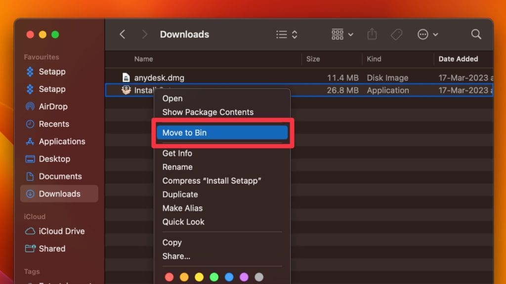 - 將所選文件拖到碼頭中的bin圖標。或者,右鍵單擊文件,然後選擇移至垃圾箱從上下文菜單。