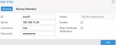 指定連接名稱、ESXi 主機的 FQDN 名稱(IP 地址)以及訪問它的帳戶(通常為 root)。檢查跳過證書驗證忽略 VMware 主機證書的選項。