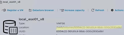 - 在 ESXi 主機上找到虛擬機文件。從 vSphere Web 界面複製虛擬機的完整路徑(格式為 /vmfs/volumes/{volume_id})