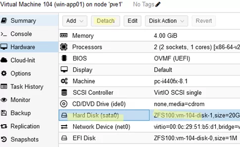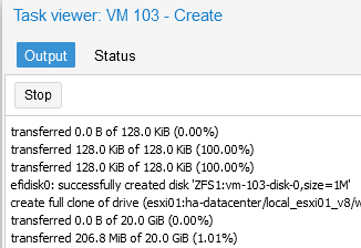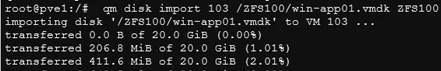 scp -v root@esxi01:/vmfs/volumes/{volume_id}/win-vm1/win-vm1.vmdk /ZFS1000/ - 然後使用以下命令將復制的虛擬硬盤導入 Proxmox 上的 VM: