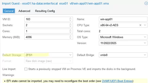 在 Proxmox 的早期版本中,您可以手動從 ESXi 主機移動虛擬機,如下所示: