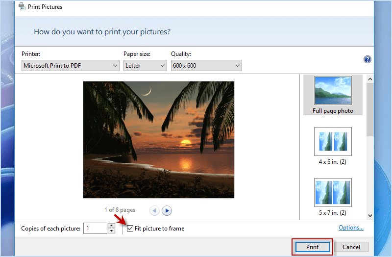 第四步:勾選使圖片適合框架並擊中列印按鈕將 JPEG 文件轉換為 PDF 文件。