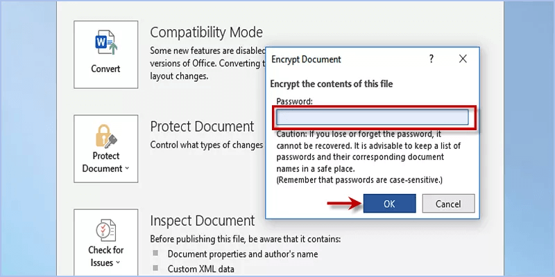 第三步:彈出密碼設置窗口,輸入密碼,點擊好的。Microsoft Word 將對內容進行加密,從而限製文檔中的 JPEG 文件在沒有正確密碼的情況下被其他人訪問。