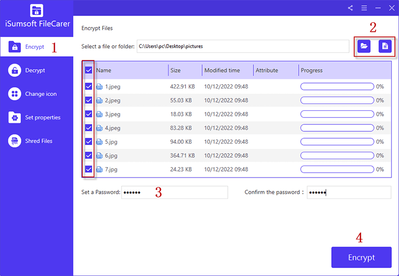如果您正在尋找在 Windows 10 中用密碼保護 JPEG 文件的最簡單、最安全的方法,iSoft FileCarer 可能是您的最佳選擇。在 iSoft FileCarer 中,加密功能使您可以通過單擊文件夾/文件圖標將 JPEG 文件添加到加密目錄。然後您可以設置一個專用密碼用於解密文件以供訪問,然後單擊加密按鈕完成保護。這確實是一種有效的方法,可以幫助您直接使用密碼保護 JPEG 文件,而無需移動、轉換或壓縮它。