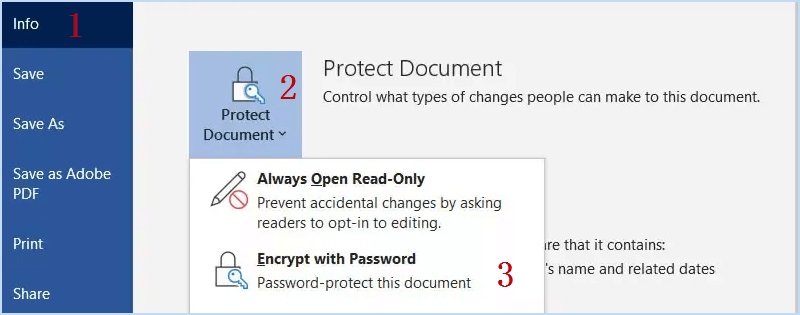 步驟2:在Word文檔中,單擊文件 > 信息。在保護文檔的下拉菜單中,選擇使用密碼加密。