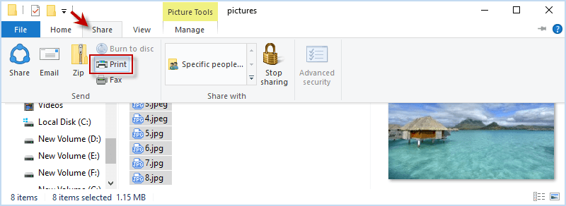步驟1:選擇文件夾中的jpeg文件。然後點擊分享選項卡並選擇列印選項。